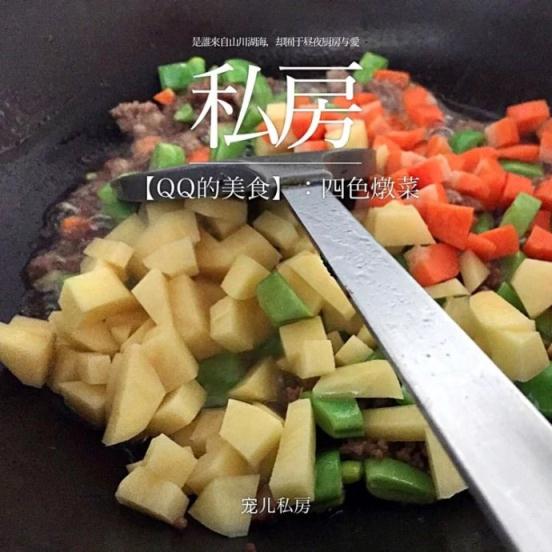 第三步:下入土豆和胡蘿卜丁,繼續(xù)翻炒至土豆和胡蘿卜變色。