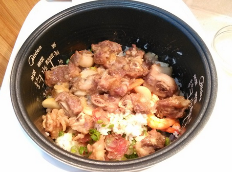 5.電飯鍋水開后倒入八成熟的排骨,同臘腸,加蓋燜到跳檔,出鍋放蔥花