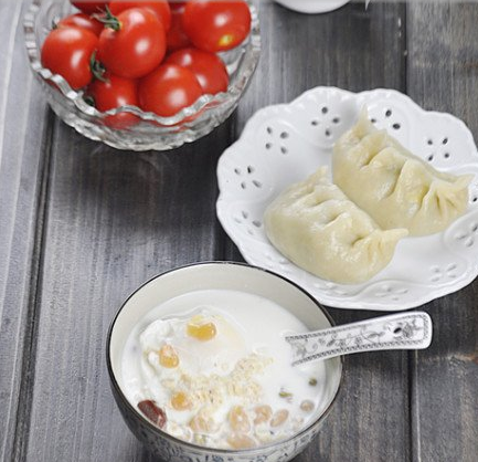 星期二 菠菜雞蛋素餡餃子+鷹嘴豆綠豆豆?jié){+小番茄