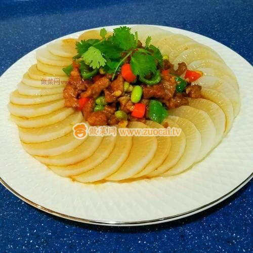 8.關火~將炒好的肉粒鏟起放在蘿卜中間