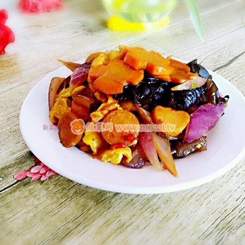 1.雞蛋磕入碗中,打散,泡發(fā)木耳洗凈撕小朵,雞肉腸切片,胡蘿卜切花形,洋蔥切菱形絲,蔥,姜切末