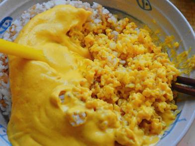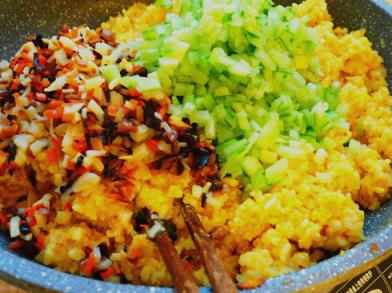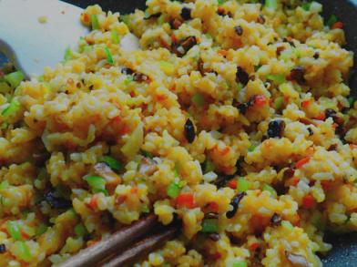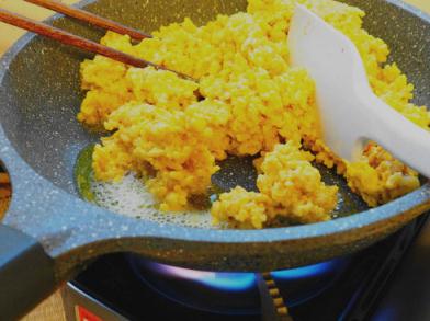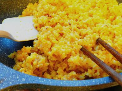 4、腐竹南瓜素蛋液與米飯混合均勻;入姜油鍋中火炒透,使干爽;