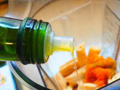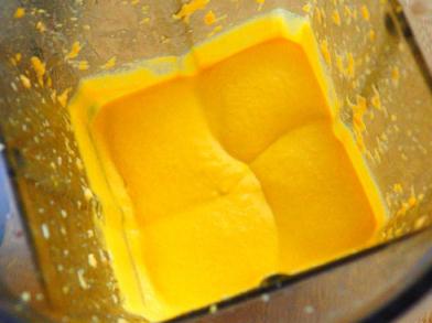 3、泡發(fā)腐竹、南瓜泥、30克西班牙橄欖油、35克水,料理機打細膩;南瓜性溫、入脾胃,補氣血;腐竹中的磷脂成分可降低血液中膽固醇,多食用能預防心血管疾病,保護心血管功能的正常運行。