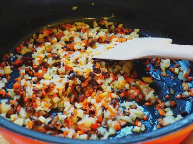 1、10克(約2茶匙)西班牙橄欖油炒泡發(fā)香菇丁、胡蘿卜丁;