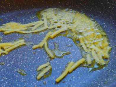 2、15ML(約一湯匙)西班牙橄欖油、姜絲、一點鹽,炒至姜絲變干黃