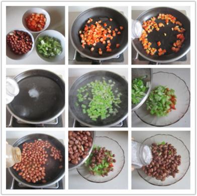 制作:1. 準(zhǔn)備好原材料; 2. 熱鍋涼油, 放入紅蘿卜丁進(jìn)去煸炒3. 煸炒幾下后加入少許鹽翻炒均勻后盛出來備用; 4. 鍋中加入適量的水, 放入少許鹽煮開; 5. 將西芹丁放入了里面焯水; 6. 焯好的西芹丁盛出來備用; 7. 再放入花生米進(jìn)去煮,加入一勺十三香(記得喲, 這是關(guān)鍵點(diǎn), 加入十三香讓花生味道更美味; ); 8. 將煮好的花生也放入同一碗中;9. 最后加入鹽、胡椒粉、醋和橄欖油等調(diào)味料, 拌均勻即可。