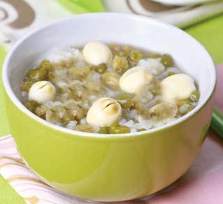 【材料】 大米50克,干百合10克,蓮子、綠豆各25克,冰糖適量。