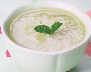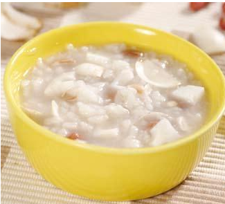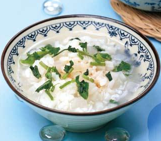 【材料】 白蘿卜100克,山藥50克,大米100克,香菜末、鹽、雞精、香油各適量。