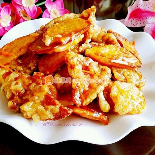 11.放入炸好的肉和地瓜快速翻炒沾勻料汁即可出鍋