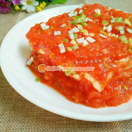 13.將炒好的番茄醬澆在豆腐上,撒點蔥花就可以了。