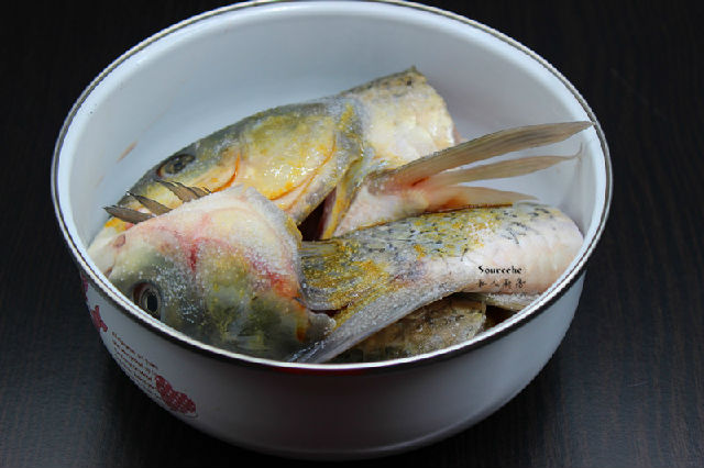2.魚頭、魚尾,洗凈瀝干水,放鹽、油、料酒、生抽腌制5分鐘;