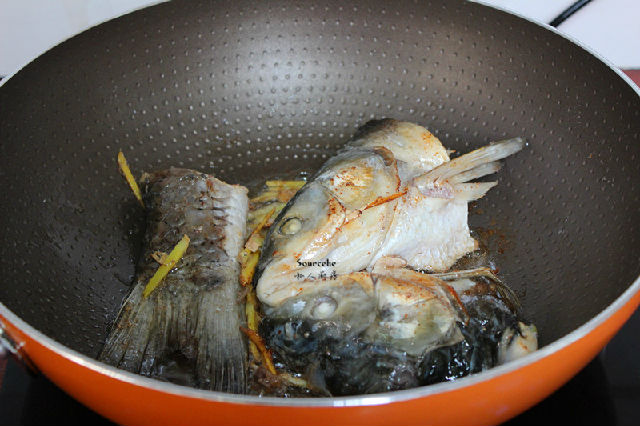 4.熱鍋,倒油,把腌制好魚頭魚尾加一點(diǎn)生姜絲煎至金黃;