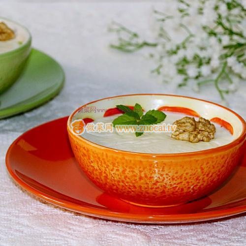 14.出鍋后將保鮮膜揭去,讓雙皮奶自然冷卻,使表面擁有厚厚的奶皮,可以溫?zé)岷笫秤?,也可以冰箱冷藏后食用,再放上?u data-GvyI="msaP9z">核桃點(diǎn)綴一下。