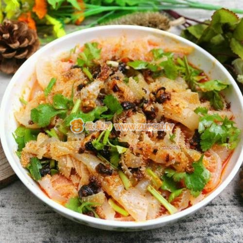 9.調(diào)制好的辣油澆在焯好的百葉上。