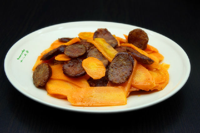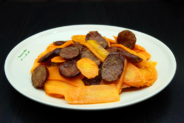 5.胡蘿卜片八成熟加入煎好的臘腸、生抽;
