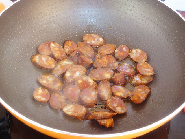 3.熱鍋,倒入一點(diǎn)點(diǎn)油,加入切好的臘腸,小火煎熟即可;