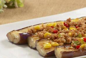 1.首先將茄子去頭去尾,一開四,在表面打上十字花刀。