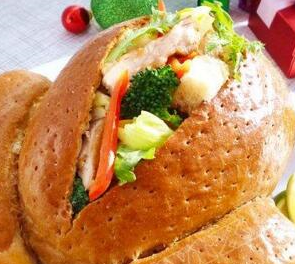 15.然后中間填入用烤雞腿加蔬菜及掏出的面包丁做成的沙拉即可