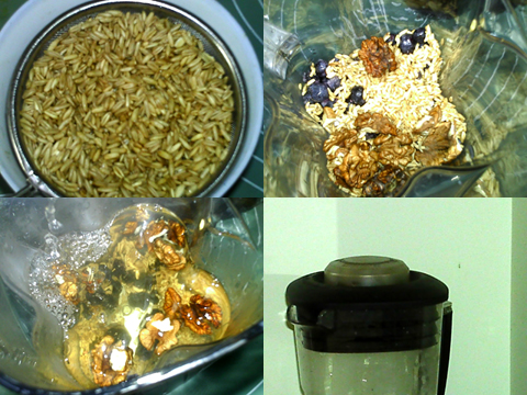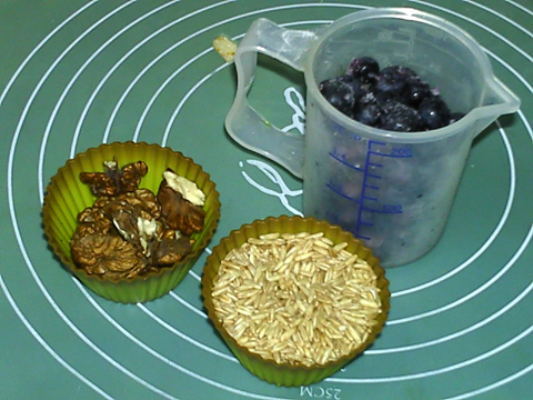 雜糧堅(jiān)果與水果的組合。葡萄是冷凍的葡萄,從秋到冬,也凍了好長時(shí)間,一點(diǎn)點(diǎn)解決掉。核桃去殼,沒炒或烤,雖然那樣會(huì)更香。三兩顆核桃,懶得費(fèi)事。燕麥的好處盡人皆知。燕麥米煮飯不太受歡迎,變成燕麥糊,則無需費(fèi)牙勁。結(jié)果看起來還不錯(cuò),葡萄的酸甜,燕麥的稠滑,核桃?被埋沒了。。。
