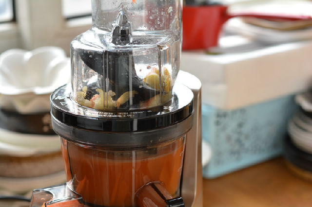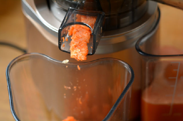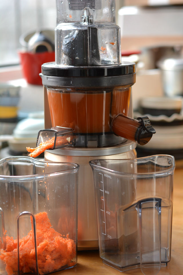 6. 將出汁口的蓋子打開(kāi),蘋(píng)果胡蘿卜汁噴涌而出;