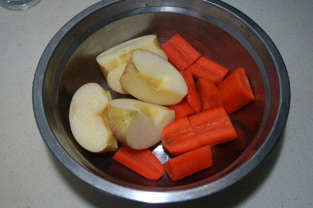 1. 蘋(píng)果洗凈,胡蘿卜刮外皮、洗凈;