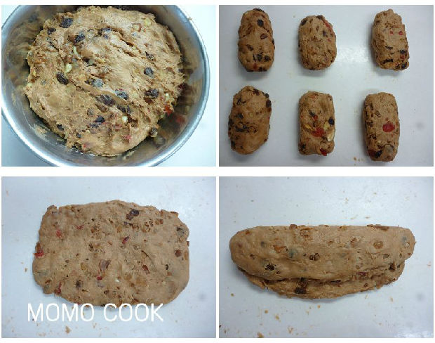 3 待面團(tuán)攪拌至脫離攪拌鋼狀態(tài)時(shí),加入朗姆酒漬果干280G 碎杏仁80G,攪拌均勻。