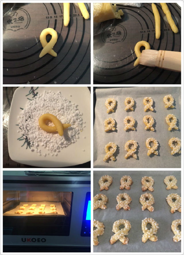 12、將刷蛋清的一面粘上珍珠糖粒