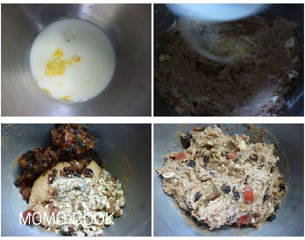 1.取一個(gè)大盆,依序加入各種葡萄干、面包粉、幼砂糖、紅糖、軟糖、胡蘿卜絲、紅櫻桃、檸檬絲、桔子絲、杏仁粉、綜合香料、面粉、蘋果塊、鹽
