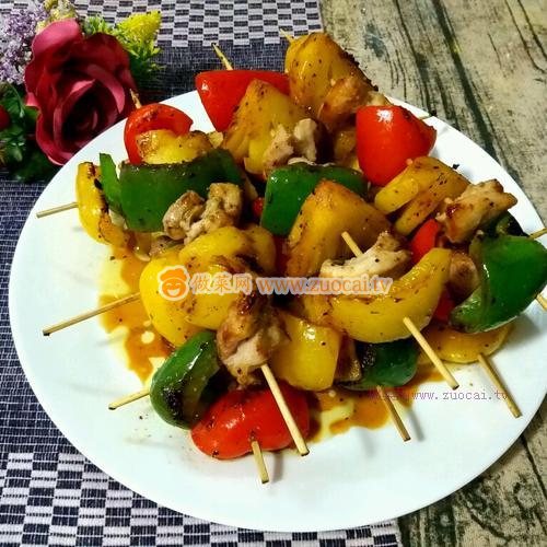菠蘿(1隻) 紅椒(1隻) 黃椒(1隻) 竹籤(10支) 雞脾肉(1隻) 黑椒碎(適量) 味椒鹽(適量) 橄欖油(適量) 醃雞肉() 雞粉(適量) 白酒(適量)