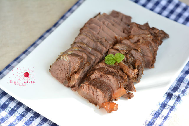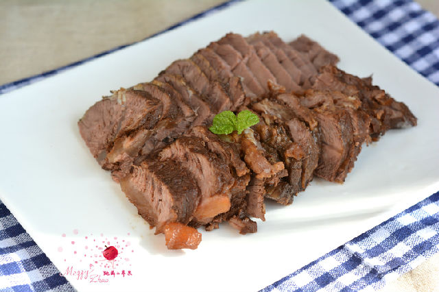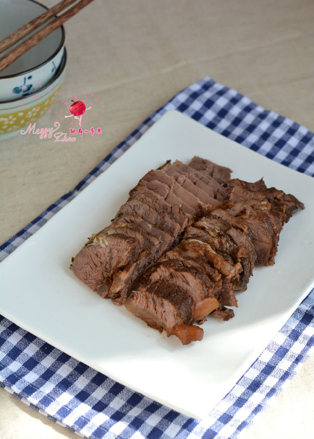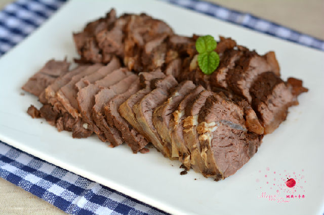 不想費(fèi)時(shí)間還想吃有滋有味兒的好肉。我用了電飯煲,用煲湯的功能慢慢煲著。頭天晚上放進(jìn)飯煲里,用煲湯的功能定時(shí)一個(gè)半小時(shí),然后就睡大覺去吧!時(shí)間到了,飯煲有自動(dòng)保溫的功能。第二天一早起來,還是熱乎乎的。而且這肉在湯里泡了一晚上,這香味、鹽味全吸進(jìn)肉里了??粗?,那味兒可不淡,而且肉也很爛乎。我都為我這個(gè)懶辦法高興了一把。燉、燜、醬,我分不清楚。因?yàn)樽詈笫谴髩K牛肉切片吃的,所以我就權(quán)且把它叫鹵牛肉吧。