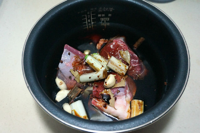 3. 牛腱子入電飯煲內(nèi)膽中,將調(diào)料、香料全部入鍋中,加夠足夠量的水;