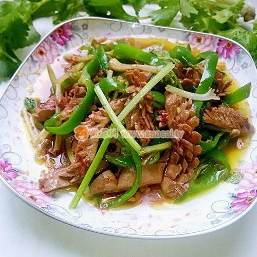 12.用少量的油將青椒芹菜斷生,先下青椒,再下芹菜,芹萊大火炒半分鐘即可,可稍放點鹽。