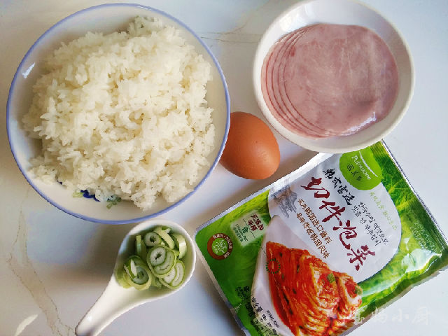 米飯390克,韓式泡菜150克(1袋),雞蛋1個(gè),火腿5片,醬油1湯匙,植物油3湯匙,蔥花13克