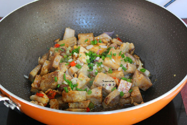 7.加入水淀粉勾芡,放生抽、香蔥炒均即可。