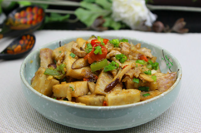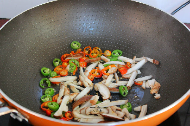 4.把煎炸過的多余油倒出,留少許在鍋中放入紅辣椒、青辣椒、香菇爆香;