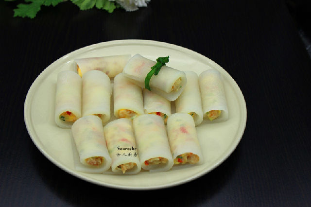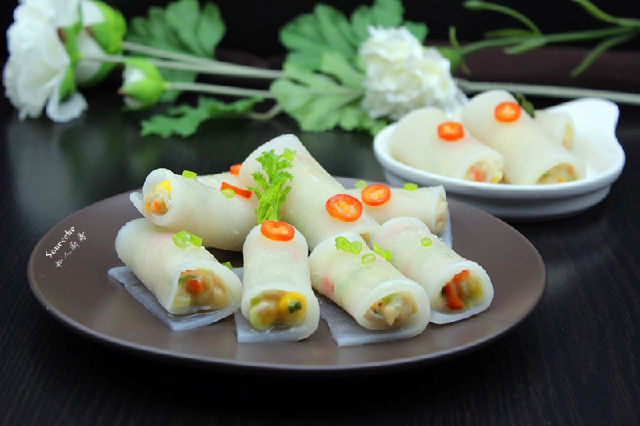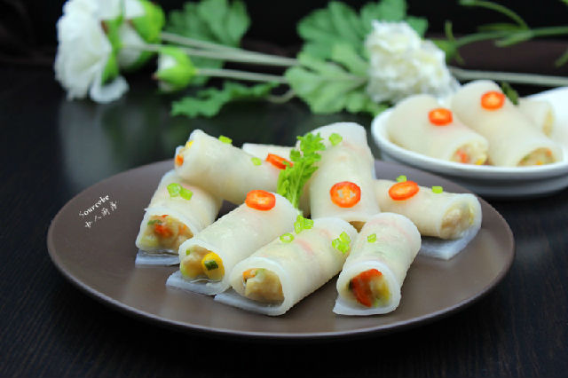 5.晶瑩剔透的蘿卜片放入調(diào)好的餡料,卷起來;