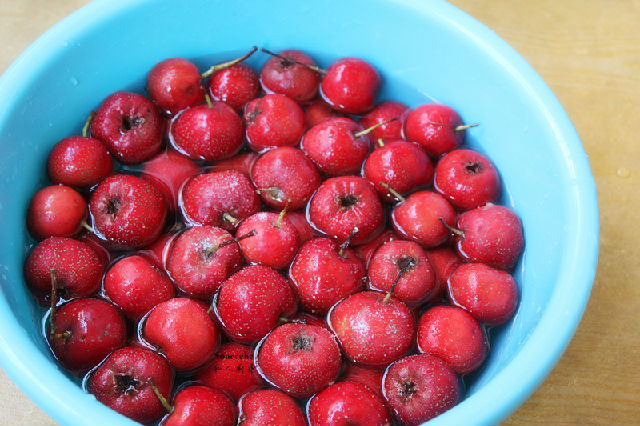 1. 新鮮山楂挑選,洗凈,鹽水浸泡10分鐘;