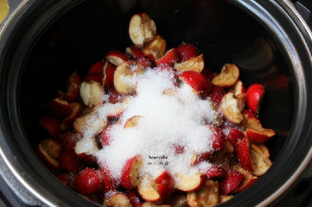 2.山楂去頭、去尾,去籽,切成四瓣;