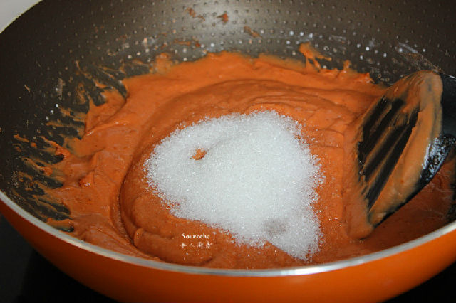 3.放入鍋中,加100克白砂糖、少許清水,煮爛;