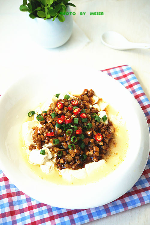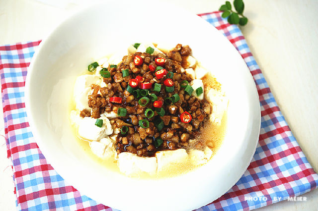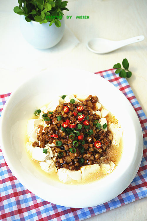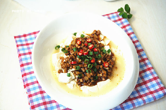 8、將肉末澆在上面,撒入小蔥、小米椒。