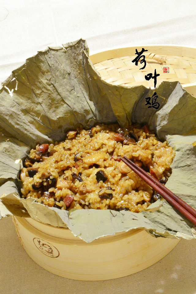 6. 將糯米包入荷葉中,冷水上鍋蒸30分鐘即可。