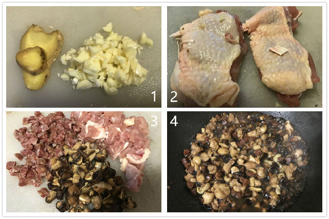 3. 香菇泡發(fā)切丁,香腸和雞腿肉切丁。