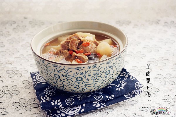 老人們常說(shuō):“吃蘿卜夏吃姜,不勞醫(yī)生開藥方”。其中就隱含著說(shuō)明了蘿卜具有的防病、治病功效。秋冬天氣候寒冷,人們多食熱物,所以胃內(nèi)容易積火。蘿卜為寒物,食蘿卜可祛火生津。所以冬天常食蘿卜。蘿卜有消食、降氣之功,對(duì)氣管炎和咳嗽有療效,且富含維生素。蘿卜還能通便、抗菌、降膽固醇、防膽石形成,還可預(yù)防高血壓和冠心病。羊肉屬于紅肉,最是溫補(bǔ)系列的肉類~秋冬季節(jié)來(lái)一碗羊肉湯從手到腳都是暖暖噠~ 白蘿卜燉的軟爛吸收了羊肉的湯汁也超級(jí)鮮美!