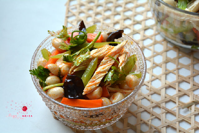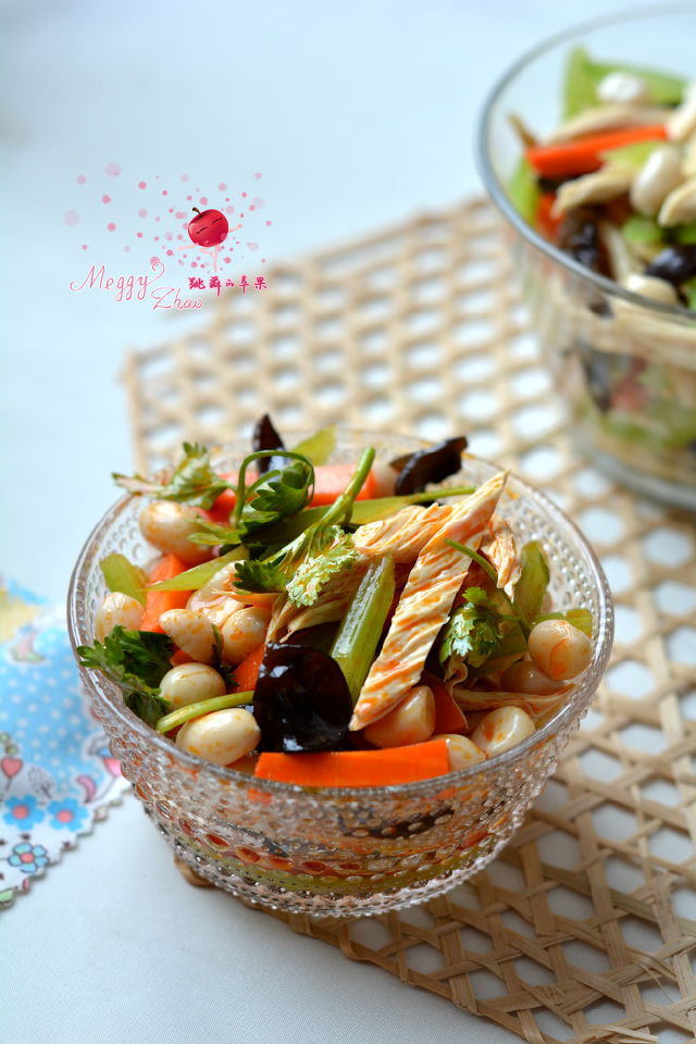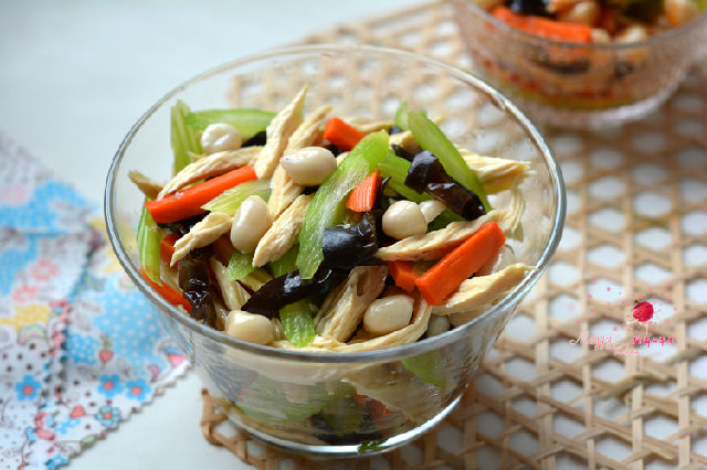 花生泡好去紅衣,又脆又嫩;芹菜有降壓降脂作用,清清脆脆;泡發(fā)的腐竹可以補(bǔ)鈣,入口有嚼勁兒;胡蘿卜經(jīng)過(guò)焯水,雖然沒讓胡蘿卜素轉(zhuǎn)化成維生素A,但漂亮的顏色和其它營(yíng)養(yǎng)物質(zhì)也起到了作用;木耳雖然不多,既豐富了顏色,又有補(bǔ)鐵、清除體內(nèi)垃圾的作用。所以這真是一道清清爽爽的養(yǎng)生菜。