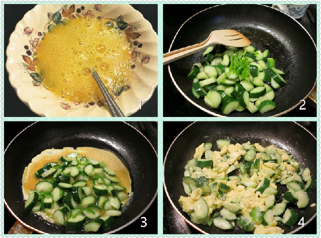 三、再起鍋,鍋熱加菜油約2湯匙,倒入蛋液和黃瓜;