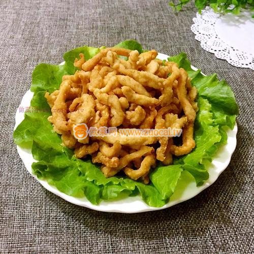 6.鍋中倒入適量油燒至六成熱時(shí)放入雞柳,中小火炸至金黃色