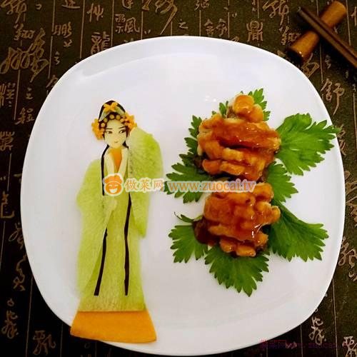 9.取出提前擺好盤的盤子,青蘿卜刻的衣服,蘋果刻皮膚,頭飾和內(nèi)裙是南瓜刻的,頭發(fā)是茄子皮~