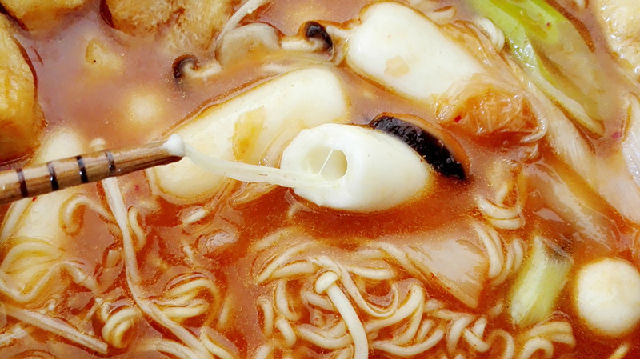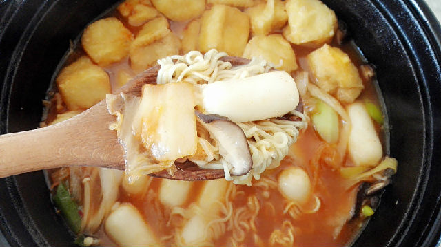 16、用筷子夾一塊年糕條,咬上一口,里面的芝士融化后拉成細(xì)細(xì)的長絲,Q彈美味,拉面浸滿所有食材的汁水變得鮮不可言,泡菜脆爽、香菇香滑可口......趕緊也學(xué)著在寒冷的冬季燉上一鍋吧!