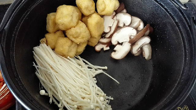 金針菇1把、香菇7-8顆、豆腐泡10-15個(gè)、芝士年糕條1袋、泡菜適量、大蔥1根、拉面1塊、韓國包飯醬適量。(親們可以根據(jù)自己喜好加入大蝦、魚豆腐、火腿腸等)