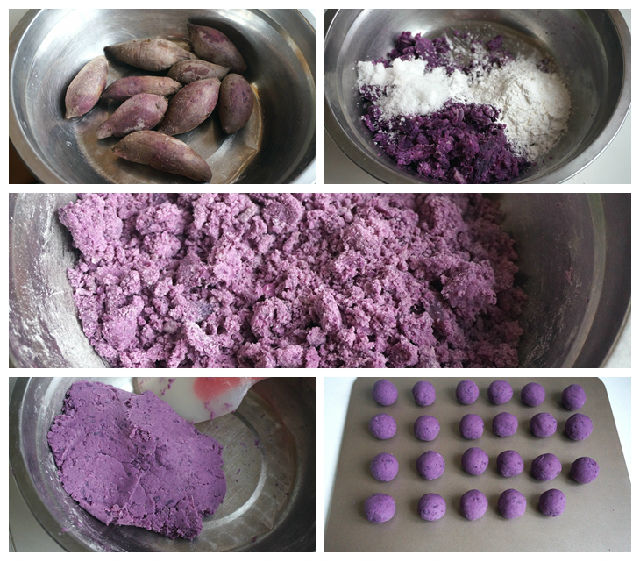 3. 清水不要放太多,一點(diǎn)點(diǎn)加入,能把紫薯泥捏成團(tuán)就可以;
